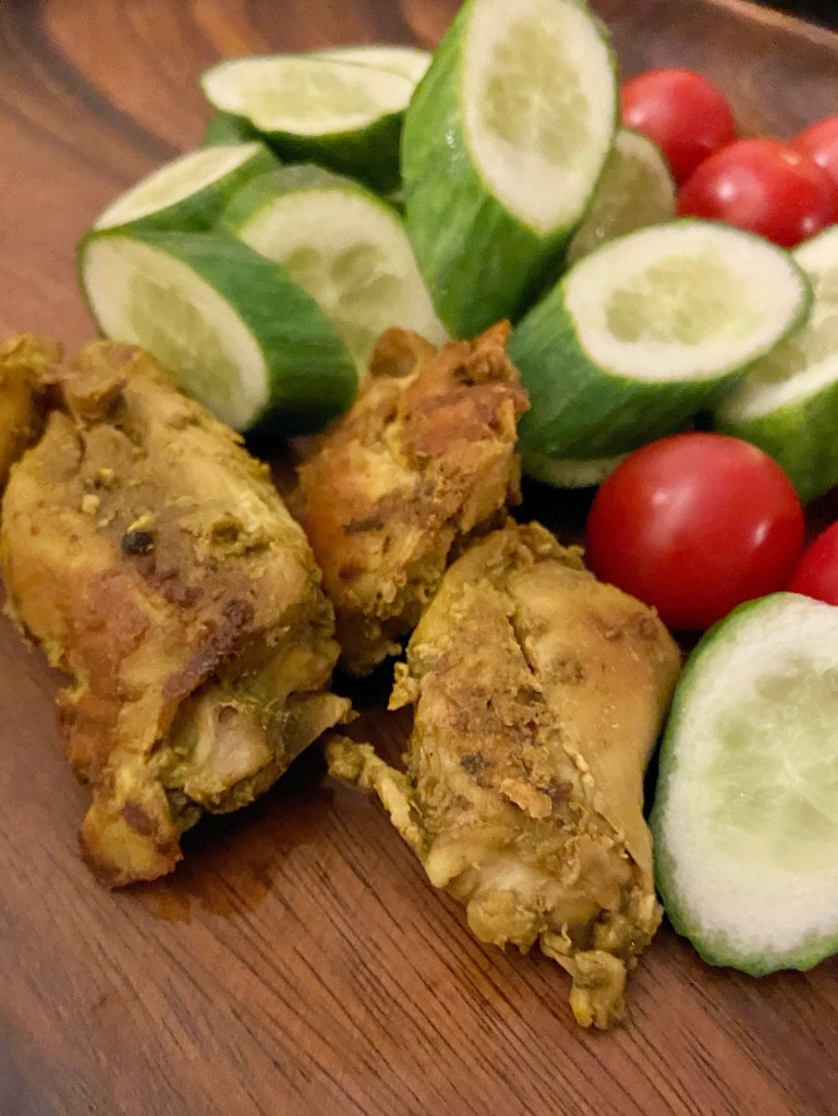 4. In a large bowl, combine the chicken thighs, minced garlic, turmeric and about 1/2 cup of Zhoug and allow to marinade for 1-2 hours.